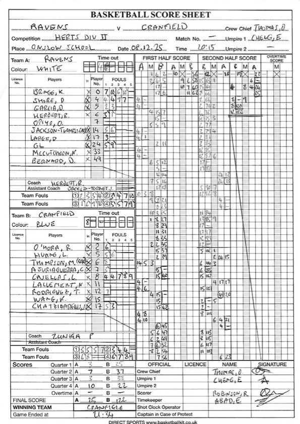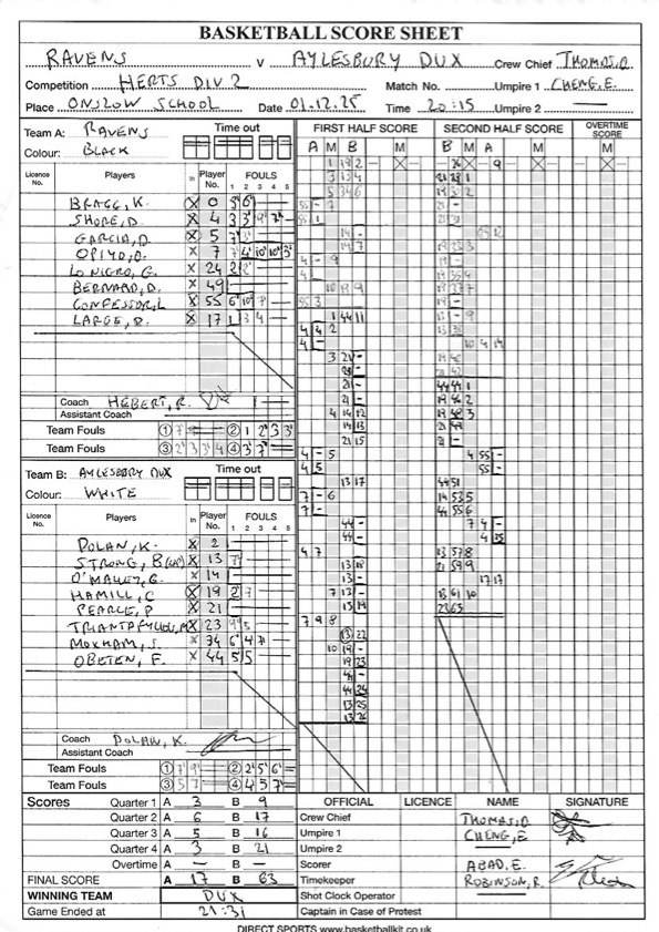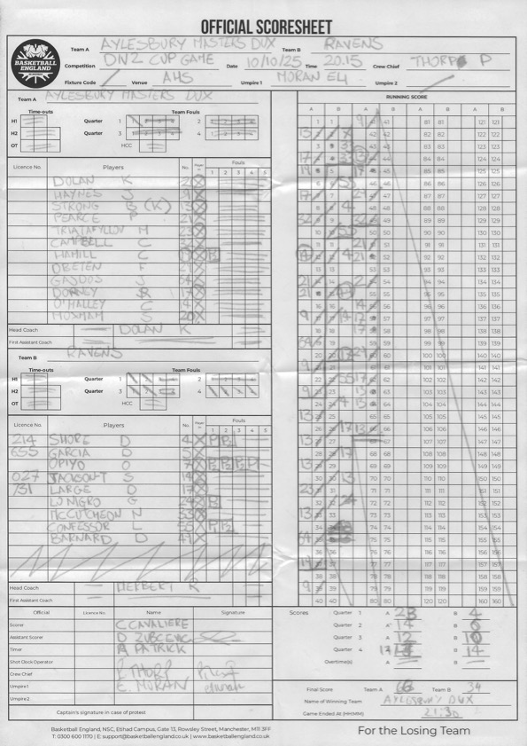 Aylesbury Dux Masters (66 - 34) Ravens (Cup) Aylesbury High School Walton Road Aylesbury HP21 7SX |