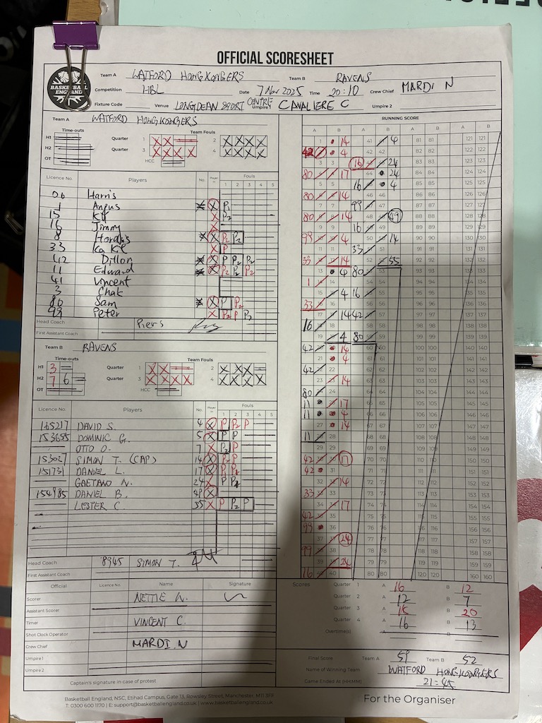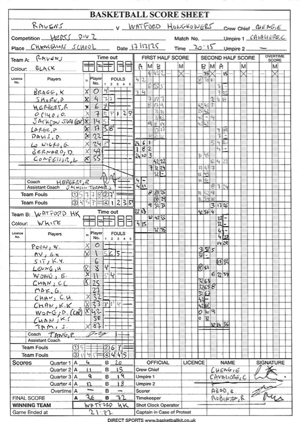 Watford Hongkongers (59 - 52) Ravens Longdean Sports Centre Hill Common Hemel Hempstead HP3 8JH