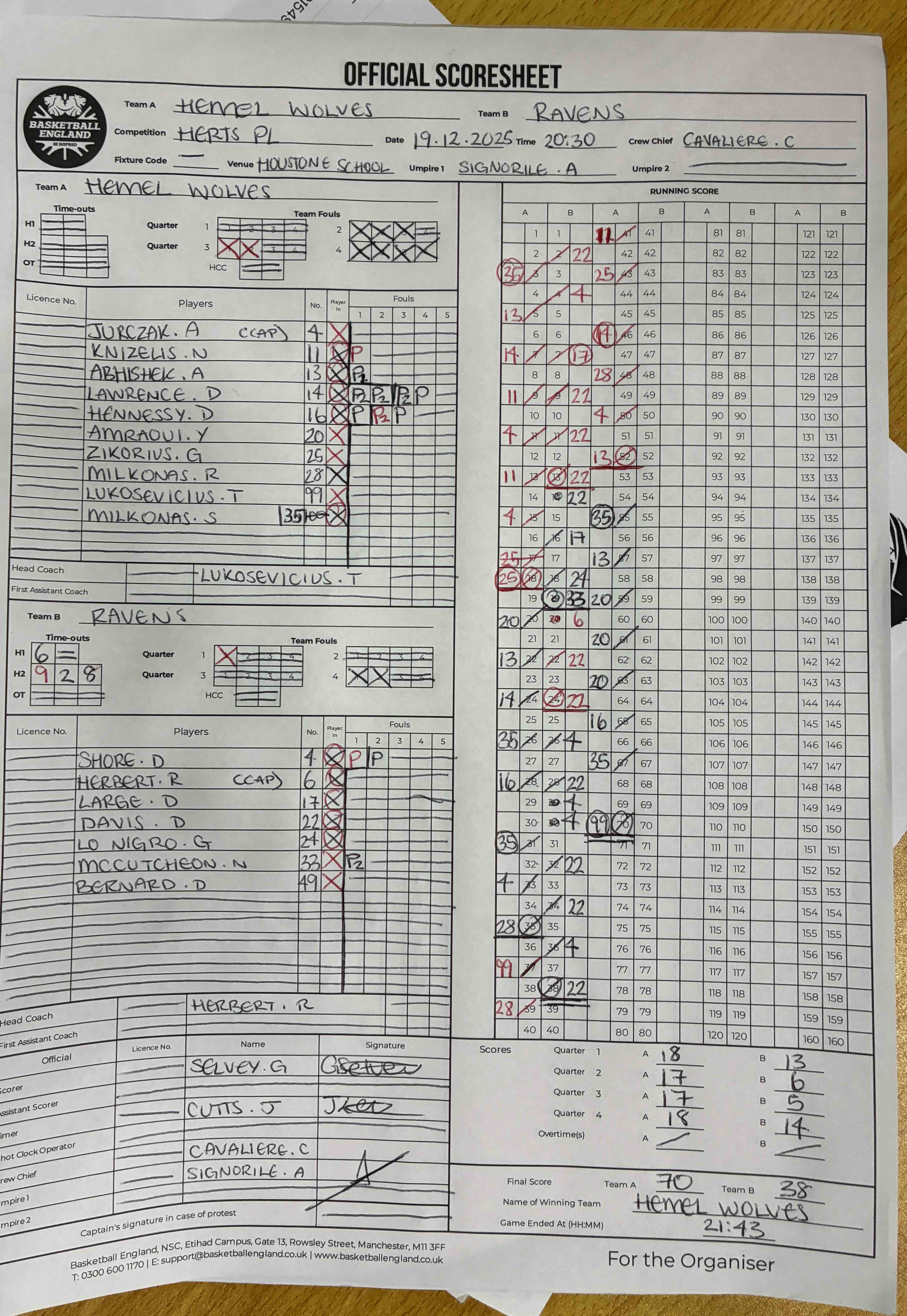 Hemel Wolves 2 (WHITE) (70 - 38) Ravens (BLACK) Houston Secondary School Parkside Drive Houghton Regis Dunstable LU5 5PX
